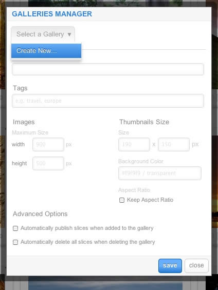 - Dropdown: To create a new Gallery, select Create New, or the name of another Gallery to edit it
