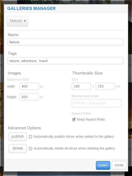 Remember to Publish a Gallery after clicking Save. If you make any changes to a Gallery, whether in the Galleries Manager, or in the Image Slice Editor, you will need to re-Save in the Galleries Manager for the changes to take place on the site.