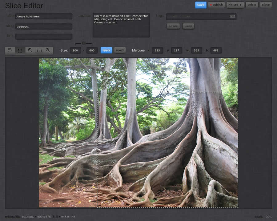 In the Slice Editor, you can edit the META data and the actual image. You can crop the image, similar to that of an native application, with a set or variable marquee, in addition to Zoom controls. Edits in the Slice Editor are on a per gallery/tag basis.