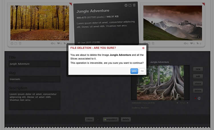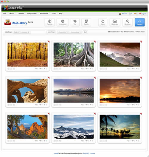 The system itself is built on a custom tag-based architecture with the ability to have multiple tag-based galleries. RokGallery uses design and concepts that have been traditionally reserved for platform-native applications and are for the first time making their way into a web environment. For example, you will not have to resize images, or make thumbs before using them in RokGallery, just upload the raw image and use the RokGallery slice editor to resize and crop the images. This non-destructive editing method allows you to create and edit your image size, cropped view, etc, at any point without having to reupload or recreate your image in external photo editing software.