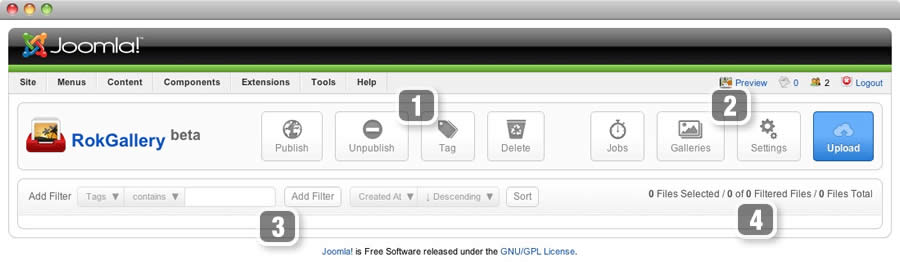 The filters have a range of variables such as gallery, file type, published etc... to allow you to sort your images for management in an efficient and simple manner. Statistics for the filters appear at #4.