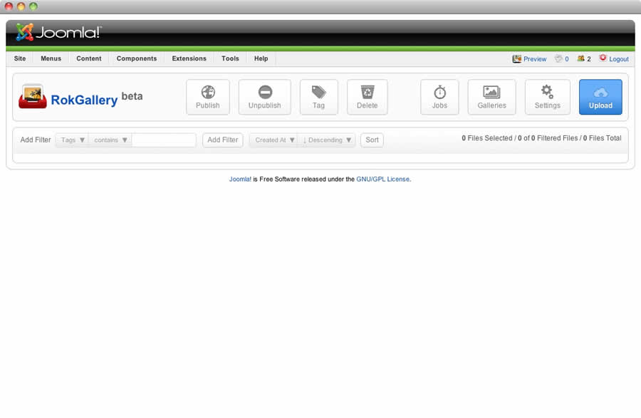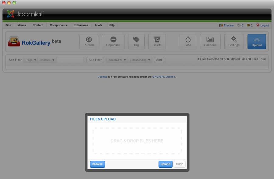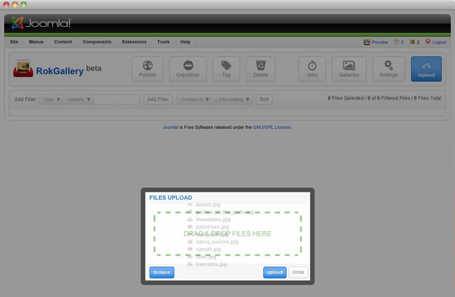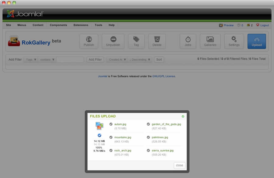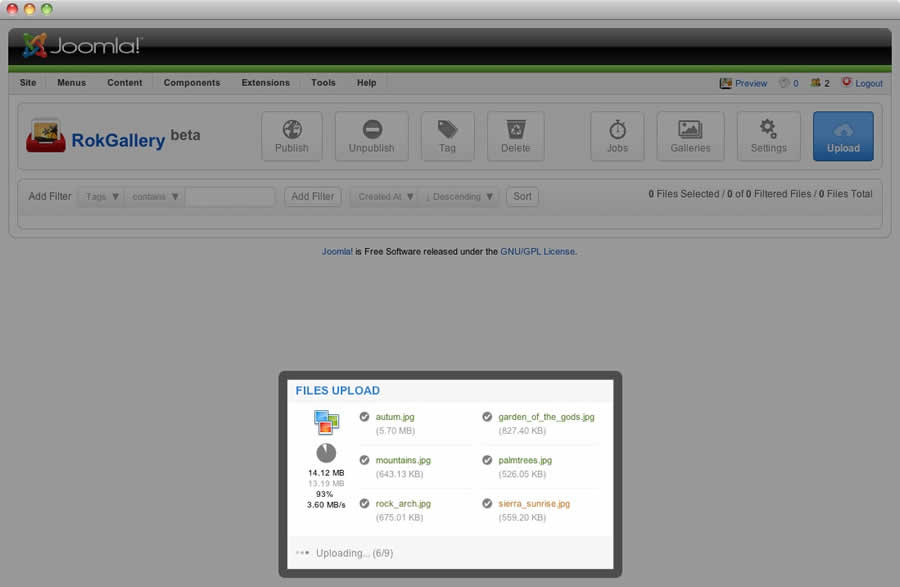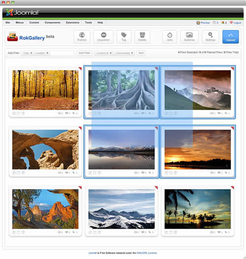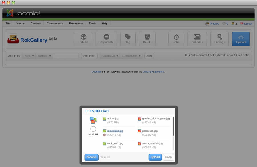 All photos will appear at Admin → Components → RokGallery. RokGallery has support for multiple image selection, either by drag and highlight with the cursor, or via individual selection with the Shift Key and click.